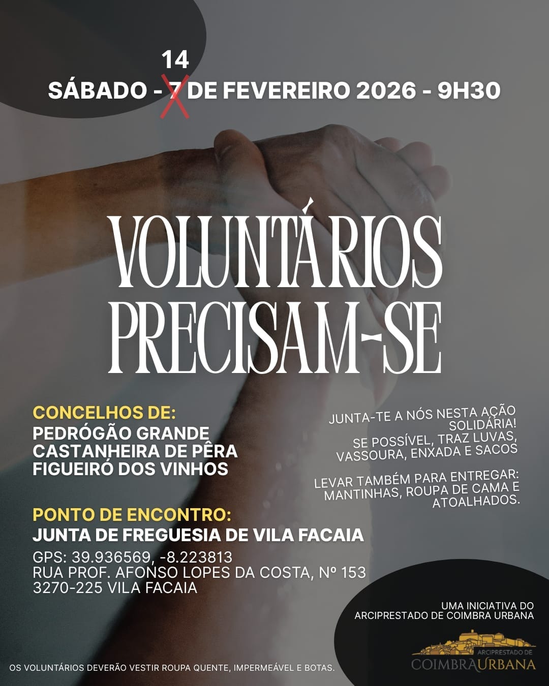 “O arciprestado de Coimbra Urbana volta a juntar-se às iniciativas de ajuda fraterna, desta vez dirigidas aos nossos irmãos da Figueira da Foz e de Coimbra que atravessam momentos muito difíceis. Vamos continuar a ajudar”, refere o cartaz da iniciativa.