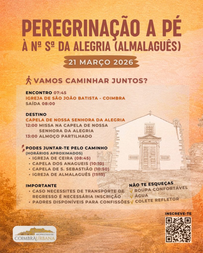 O Arciprestado de Coimbra Urbana promove no sábado, 21 de março de 2026, uma peregrinação a pé até à Capela de Nossa Senhora da Alegria, em Almalaguês, num percurso de trilhos entre a cidade e a periferia.