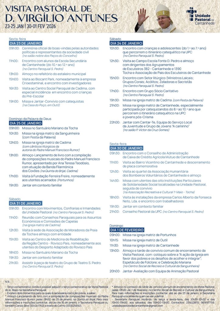 “A Unidade Pastoral de Cantanhede é constituída pelas paróquias de Cadima, Cantanhede, Outil, Portunhos, Sanguinheira e Tocha, e a visita pastoral foi organizada pela Equipa de Animação Pastoral, considerando as determinações do senhor bispo e ouvido o Conselho Pastoral, em estreita colaboração com o Município de Cantanhede e outras entidades públicas e privadas”, revela nota enviada ao Correio de Coimbra.