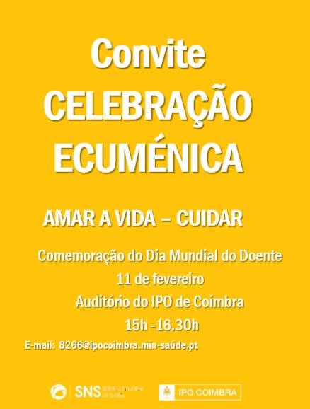 O IPO de Coimbra, sob a coordenação do Assessor Espiritual, promove um Encontro Ecuménico, aberto à participação de todas as pessoas e comunidades interessadas, no dia 11 de fevereiro.