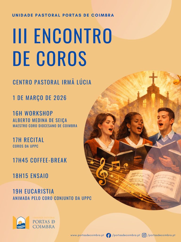 O III Encontro de Coros da Unidade Pastoral Portas de Coimbra vai acontecer no próximo domingo, dia 01 de março, no Centro Pastoral Irmã Lúcia, a partir das 16h00.